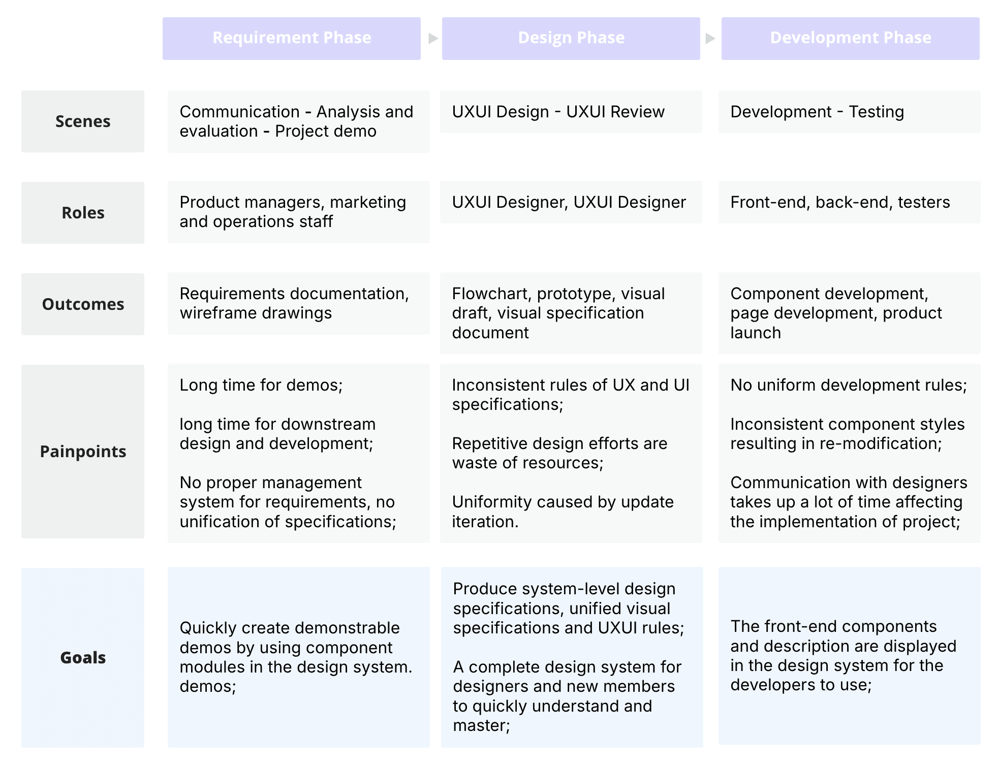 To understand the different roles' use cases and requirements for the design system, we engaged with 3 product managers, 3 designers, and 3 developers to learn about their experiences with using the design system, which led to the following table.